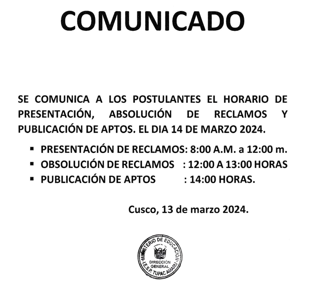 ABSOLUCIÓN DE RECLAMOS Y CRONOGRAMA DE SESIÓN DE APRENDIZAJE - PROCESO CONTRATACION DOCENTE 2024