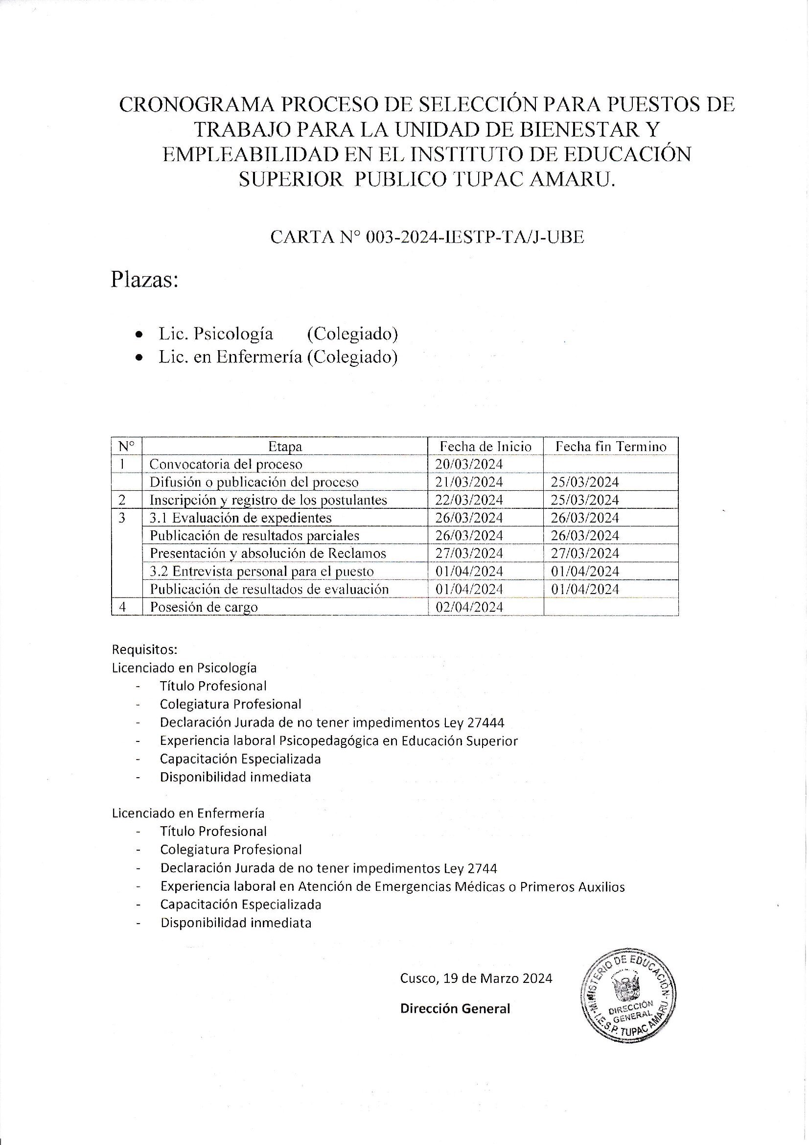 CRONOGRAMA PROCESO SELECCION PUESTOS DE TRABAJO UNIDAD DE BIENESTAR Y EMPLEABILIDAD
